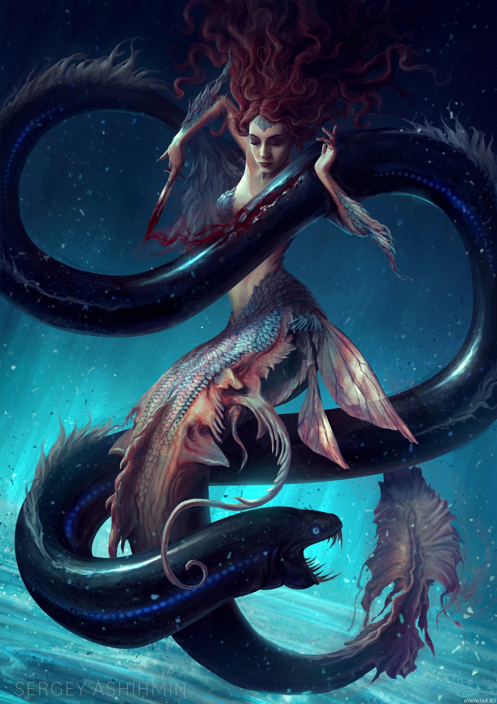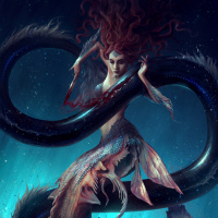 red hair. She is seated on the lower body of a large, coiled snake, which appears to be underwater. The mermaid's tail and scales are visible and resemble those of a fish, while she has arms and hands that are human-like in appearance. Her expression seems contemplative or introspective as she gazes at