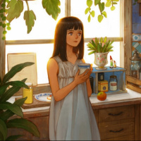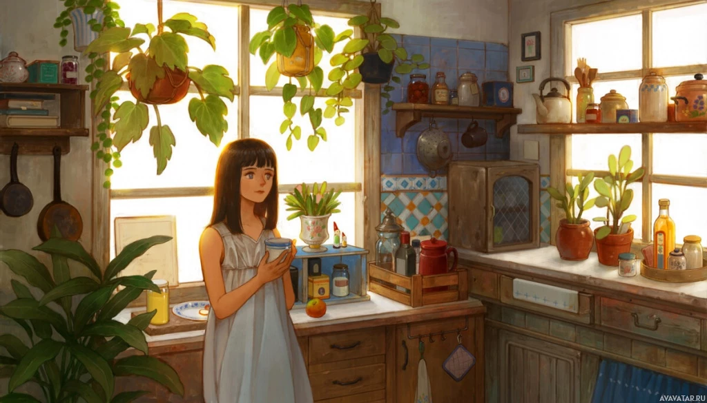 wooden shelves and cabinets, and various pots, plants, and decorations can be seen in the background. The style of the artwork suggests it could be from an animation or illustration rather than a photograph.
