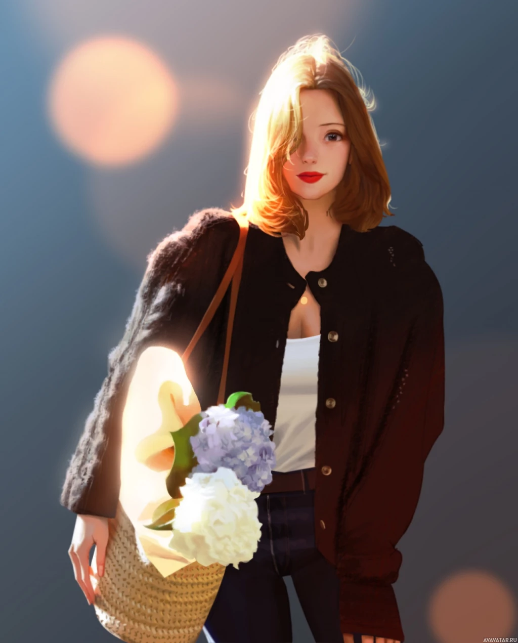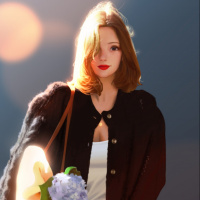 a short bob, and she has on a light-colored top and jeans. She's also wearing a dark cardigan over the top. The background features bokeh effects with blurred sunlight filtering through, creating