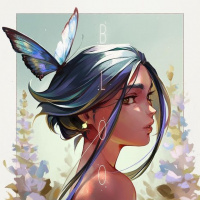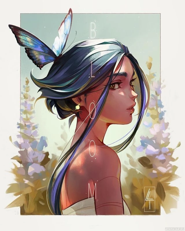 the serene atmosphere of the artwork. The character is looking off to the side with
