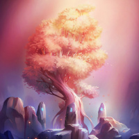 sky background. The tree is surrounded by rocks and boulders that appear to be floating or suspended in mid-air around it. There are also small figures of what seem like