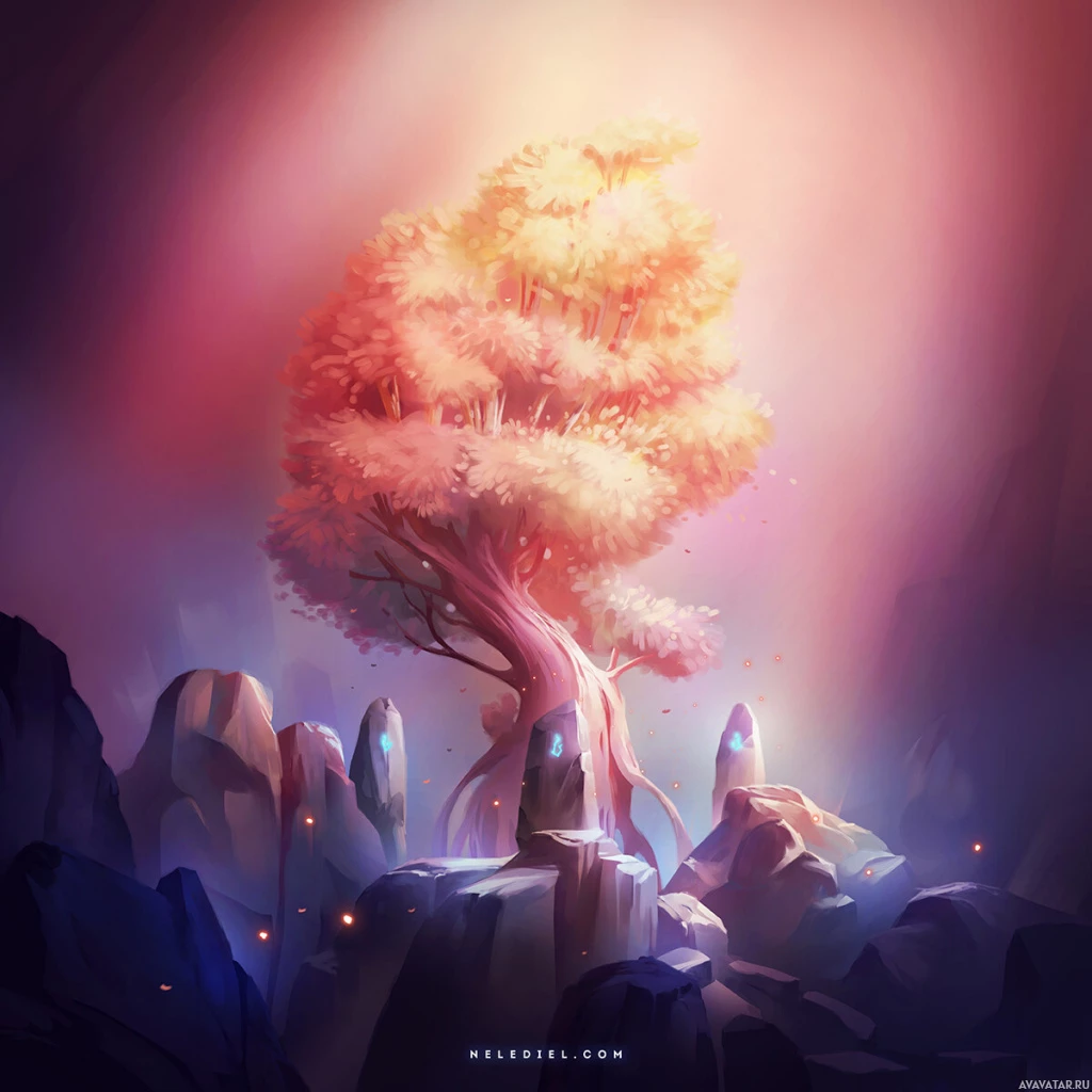 The image depicts an illustration of a tree with vibrant, multicolored foliage set against a dramatic