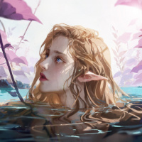 green plants that resemble ferns or other aquatic foliage. She has long, flowing hair, and her expression seems contemplative or serene. The lighting and color palette give the scene a magical, ethereal quality that is typical of fantasy-themed artwork.
