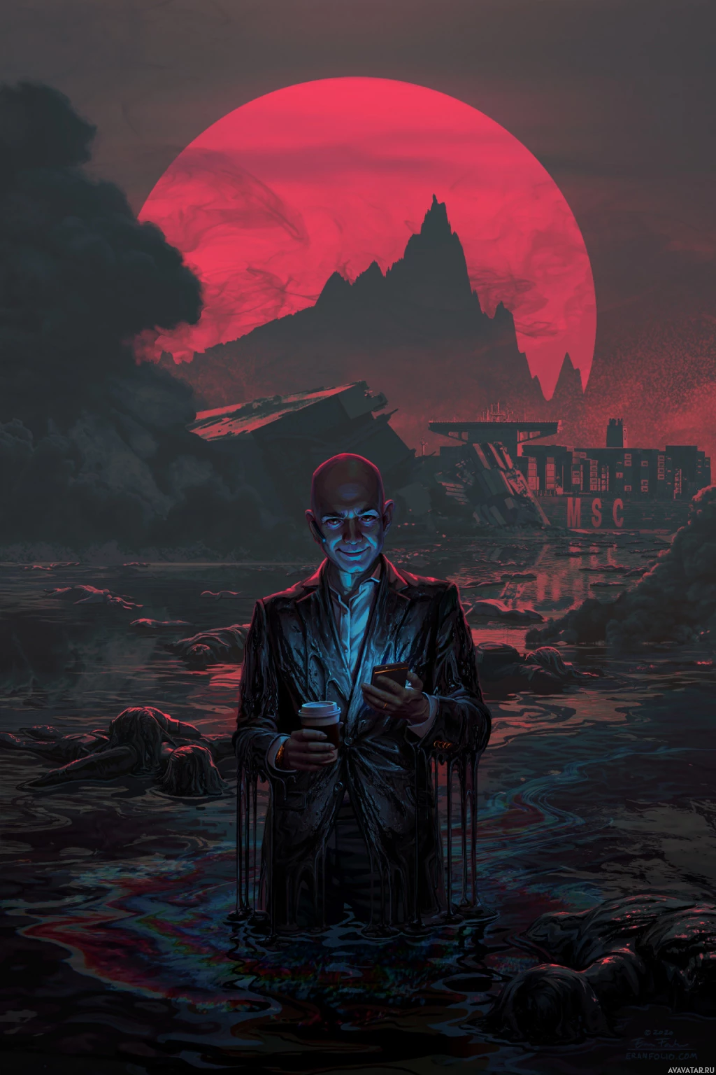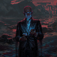 The image depicts a dark and surreal landscape, reminiscent of a dystopian or horror theme. At the center of the scene is a bald figure wearing a suit and holding what appears to be