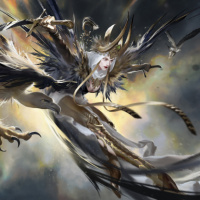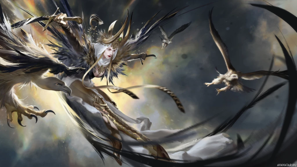 multiple birds, possibly as companions or elements of its design. There are also several doves around it. The artwork is rich in detail and color, with dramatic