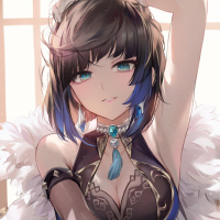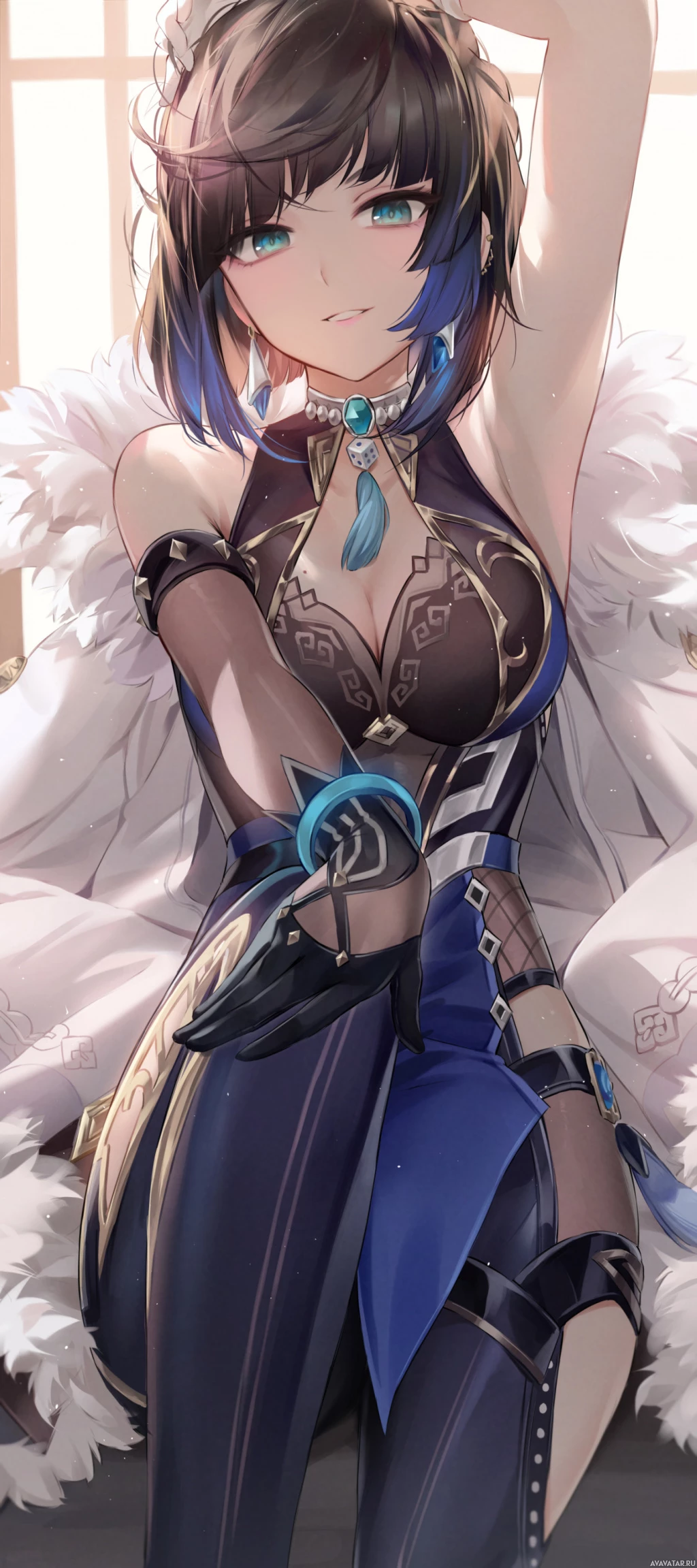 На картинке изображен анимационный персонаж, который выглядит как девушка. У нее поразительные голубые волосы, и она одета в одежду, напоминающую фэнтези или боевик, включая укороченный топ с перьями, черепами и доспехами. Этот персонаж может быть из аниме-сериала, учитывая предоставленный контекст.