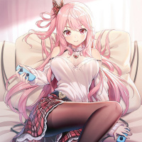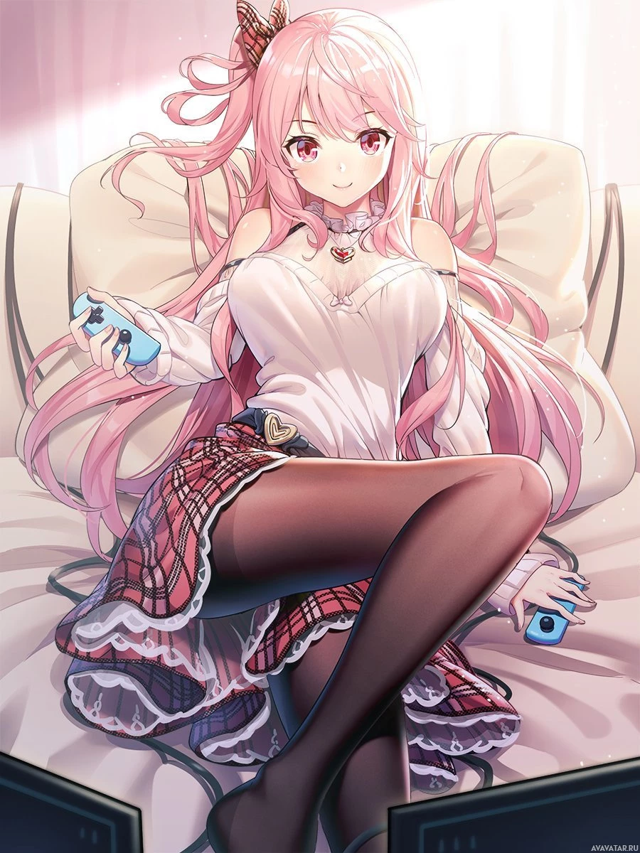 pink hair and glasses, wearing a white top and checkered skirt. She is lying on a bed and holding game controllers in her hands, suggesting that she might be engaging in
