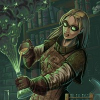 blonde hair and is wearing what seems to be an armor piece over her attire, which could indicate that she's in a setting with fantasy elements or that it's part of her costume as a witch. The character is holding a wand and appears to be mixing ingredients in a cauldron on the table before her. There are bottles, flasks, and other scientific equipment scattered around her, indicating