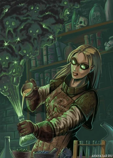 The image shows a character who appears to be a witch or alchemist, surrounded by