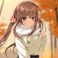 brown hair and a flower in it. She's wearing a white sweater, a beige skirt, and has her hands tucked into her pockets as she walks through what appears to be an autumn setting, possibly a park or garden during