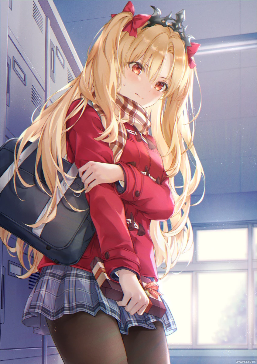 a red jacket over a plaid skirt, black knee-high socks, and appears to be in a school environment, possibly a classroom or hallway, as indicated by the lockers in the background. The character's expression seems contemplative or mildly upset.