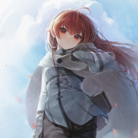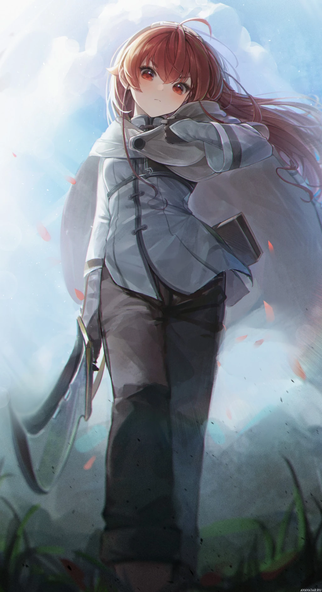 На картинке изображен анимационный персонаж. Этот персонаж - молодая девушка с рыжими волосами, одетая во что-то похожее на школьную форму: белую рубашку и темные брюки. В руках у нее что-то похожее на меч или похожее длинное оружие. Фон предполагает обстановку, которая может быть частью сюжетной линии, включающей конфликт или приключение.