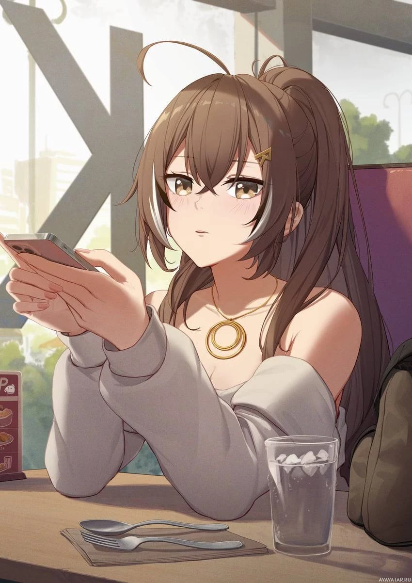 a young woman with brown hair and glasses, sitting at a table indoors. She is holding a smartphone in her hand, looking down at the screen with