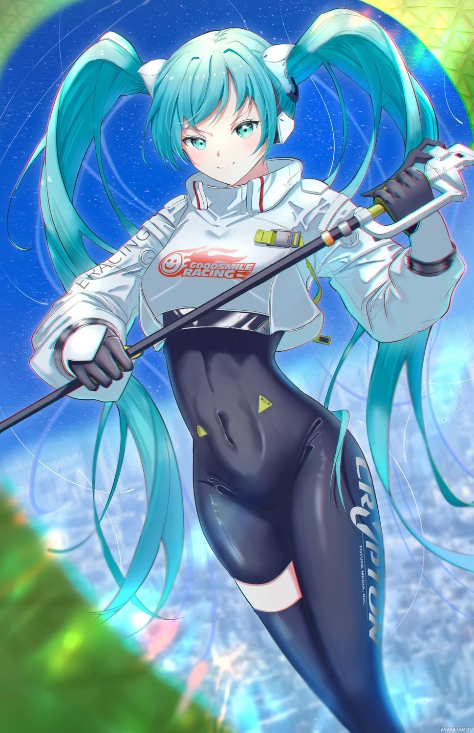 an animated character known as Hatsune Miku, a popular Vocaloid software voicebank. She has long turquoise twin-tails and is depicted in