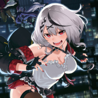 white hair. She is wearing a costume that appears to be inspired by a fantasy or action theme, featuring elements like armor and what looks like a cape or scarf. She has an excited or determined expression on her face. In the background, there are silhouettes of other figures, possibly suggesting she is not alone in this scene. The setting seems to be at night in