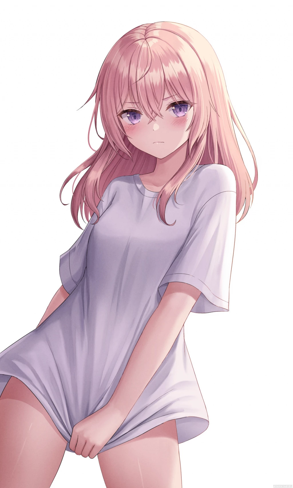 a white shirt or dress, which is slightly pulled up at the waist, revealing her thighs. The character is drawn in a cute and stylized manner typical of anime artwork.