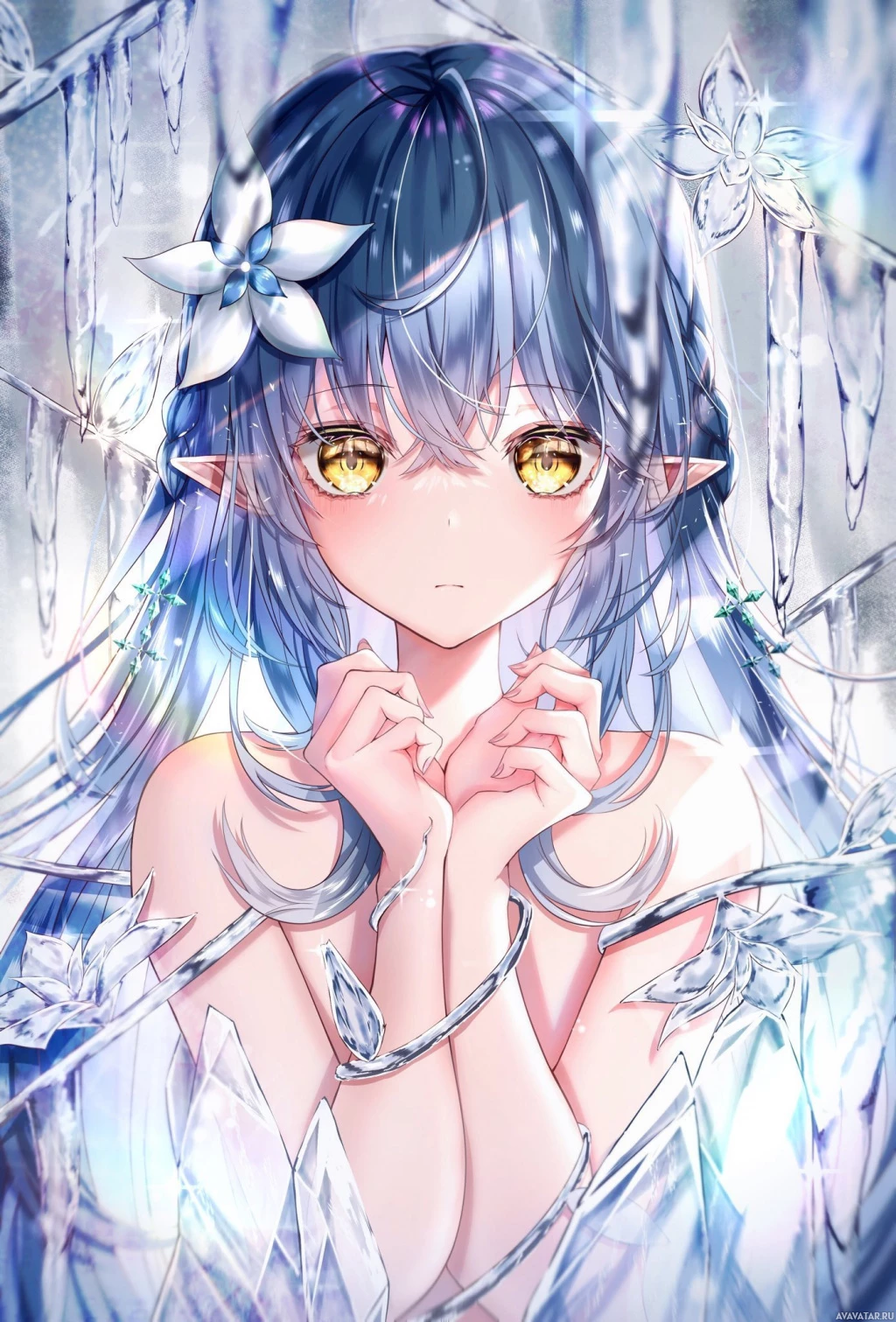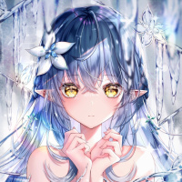 На картинке изображен анимированный персонаж с голубыми волосами и короной на голове. У этого персонажа эльфийские черты лица, такие как заостренные уши, и он окружен чем-то похожим на ледяные или кристаллические образования, которые подсвечиваются сзади. Это изображение в стиле фэнтези, которое обычно ассоциируется с аниме, учитывая особый стиль анимации и дизайн персонажей.