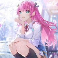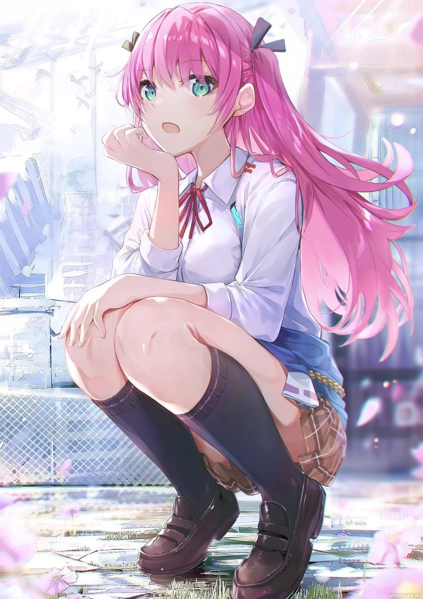 an animated character with pink hair, sitting on what appears to be a rooftop covered in cherry blossoms. She is wearing