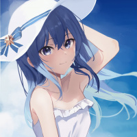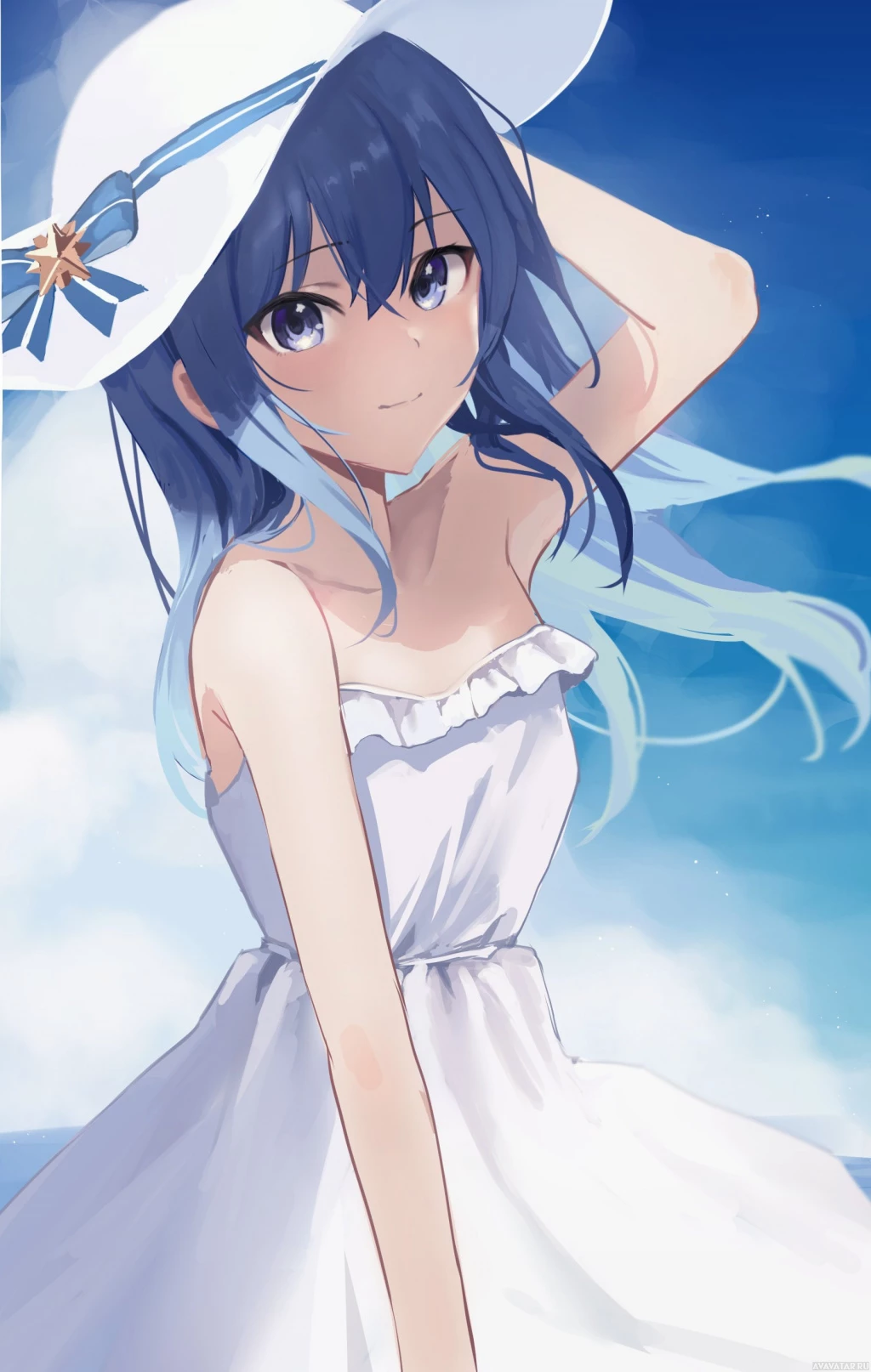 На картинке изображен анимационный персонаж, молодая девушка с голубыми волосами, одетая в белое платье и шляпу. Кажется, что она стоит на улице в ясный день, о чем свидетельствуют голубое небо и облака на заднем плане. Стиль анимации напоминает японское аниме, которое отличается яркими красками и динамичным оформлением.