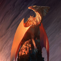 a fantasy scene with a dragon. It appears to be an illustration rather than a photograph, given the style and composition. The dragon is perched atop