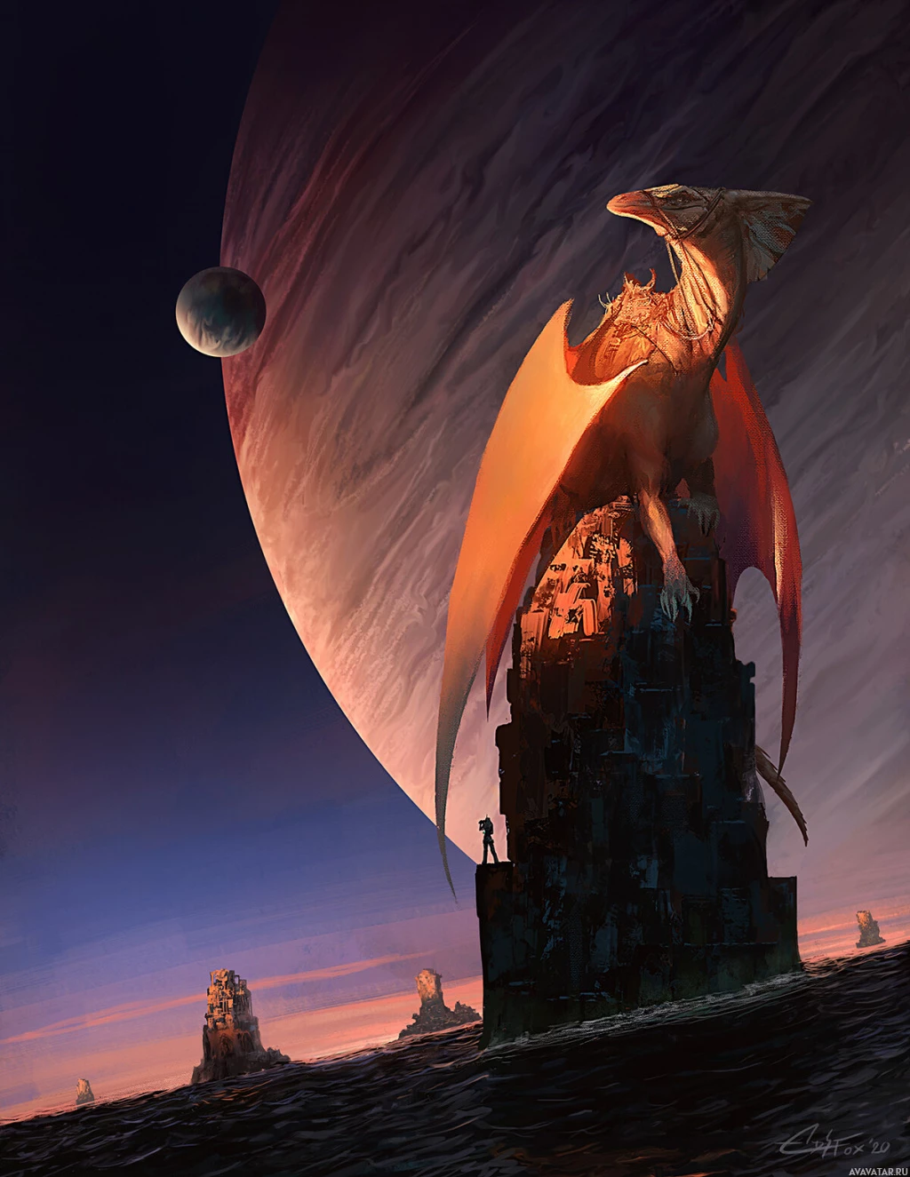 a rocky outcropping or platform that looks like it could be on another planet or moon due to the presence of celestial bodies in the background and the otherworldly landscape. Below the dragon's perch, there is a figure standing by what appears to be