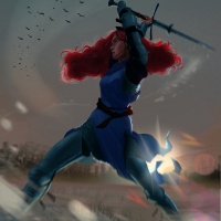red hair, who appears to be dressed in armor and wielding a sword. She is standing confidently on what looks like a battlefield or war-