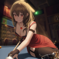 lit room resembling a bar or pub environment, indicated by the presence of a glass on the table and a bottle in the background, suggesting she might have been enjoying some drinks during her game.