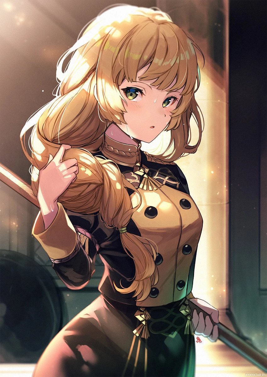 blue eyes and is wearing what looks like a military-style uniform, which suggests she might have a role in the storyline related to war or combat. The background gives off an industrial or machinery vibe, indicating that this scene could take place in a factory or
