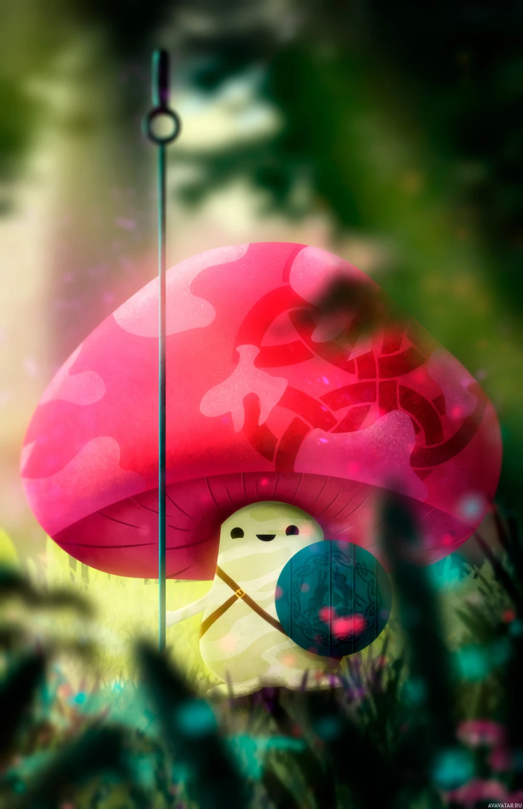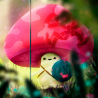 a whimsical feel to the image due to the anthropomorphized mushroom character.