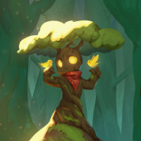 a forest setting, surrounded by green foliage and tall trees that create a dense backdrop. On the character's head are two small birds perched, which adds to the whimsical