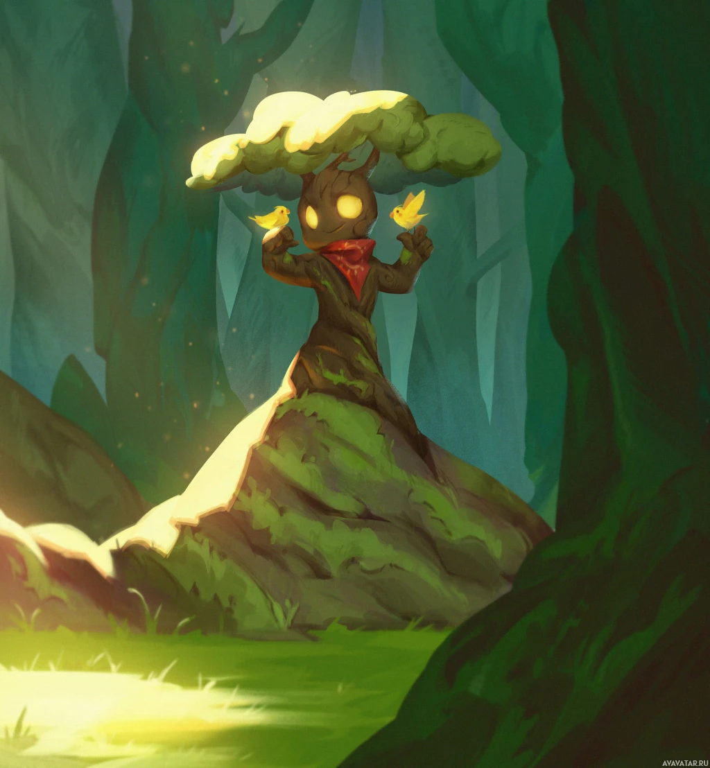 a fantasy scene featuring an animated character resembling a tree with a friendly face. This character is standing amidst