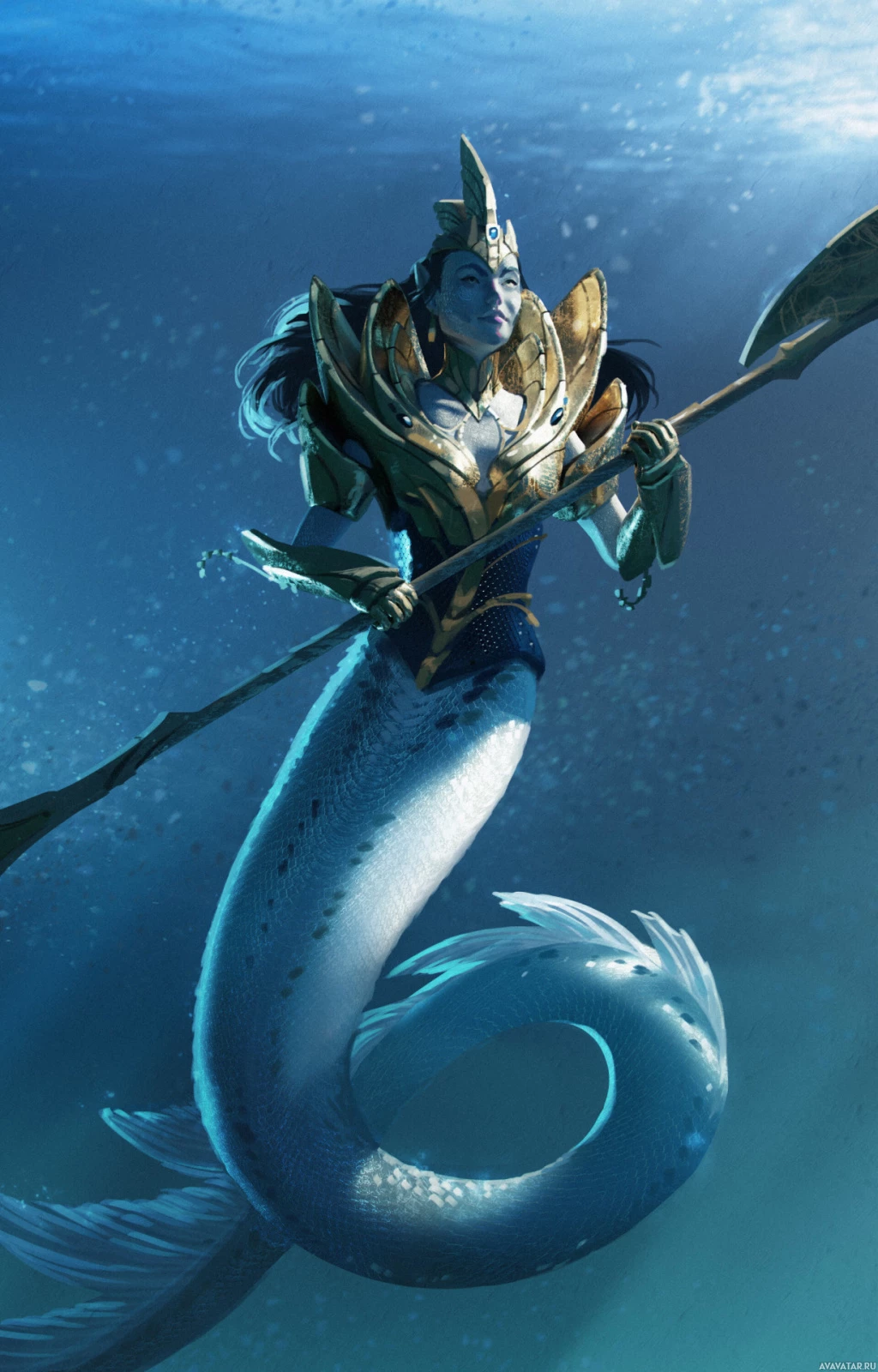 The image depicts a fantasy-style character that appears to be a mermaid or naga. It is an artistic representation of such a creature, shown in the water with scales and a tail, along with what looks like a human upper body complete with armor. The character is holding a weapon, which could be interpreted as a trident or spear typically associated with marine-based characters in