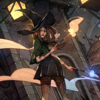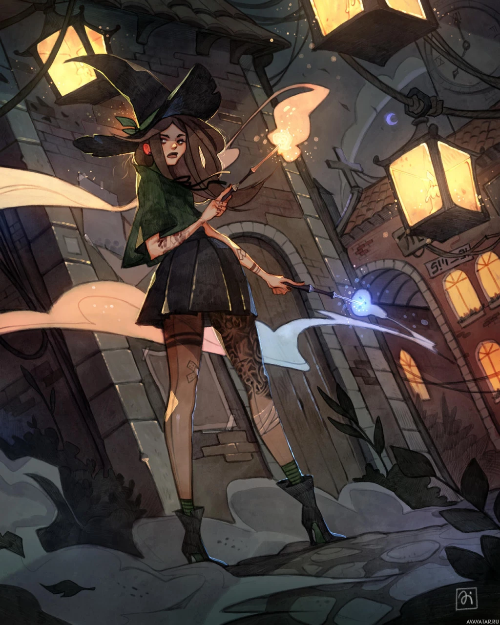 a green dress and has a broomstick in her hand, which are common elements associated with the iconography of witches. The setting seems to be an old-fashioned street or alley with cobblestones, lamps, and architectural details that suggest a historical or fantasy-themed background.
