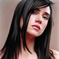 The picture features a woman with long dark hair and striking red lipstick. She appears to be looking off to the side with a serious expression. Her makeup is done in a way that accentuates her eyes and lips, giving her a dramatic look.