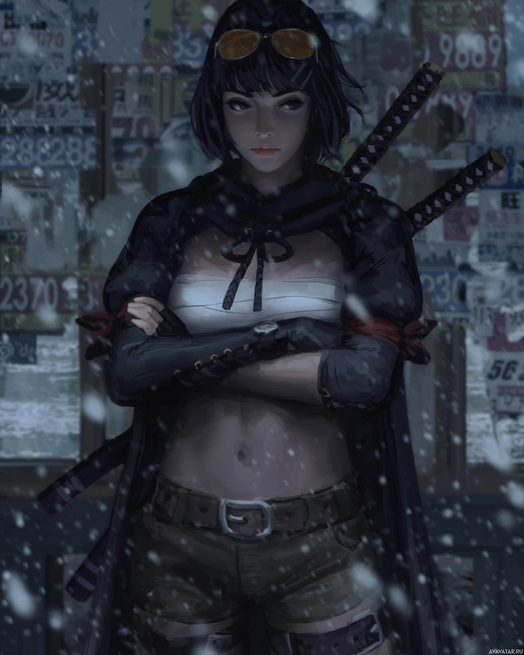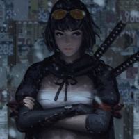 a black outfit with some orange accents, and there are samurai-style swords attached to her back. The setting looks like it could be a street or