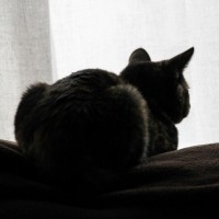 a silhouette of a cat perched on what appears to be the armrest or back of a couch. The cat is looking out through