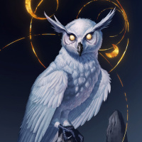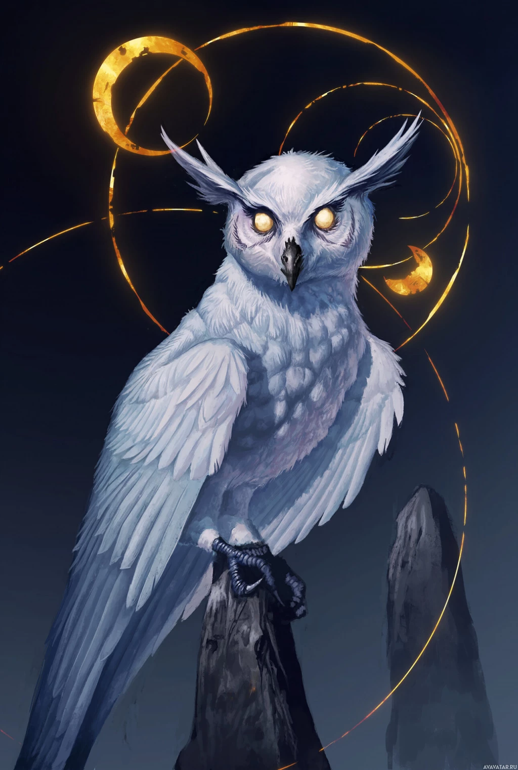 The image depicts an owl, which is a bird. It is shown in profile view against a backdrop that appears to be a mystical or magical setting, possibly related to the moon given the circular motif that resembles