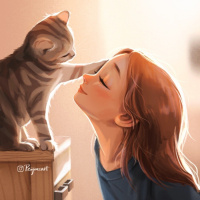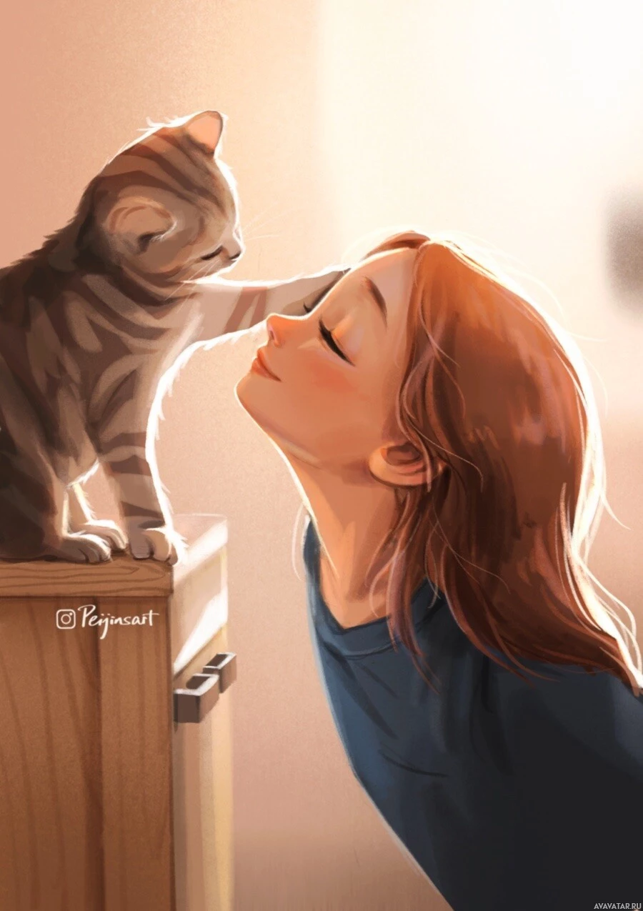 На картинке изображена рыжеволосая женщина, которая наклоняется, чтобы погладить кошку или прикоснуться к ее морде. И девушка, и кошка смотрят вверх, возможно, друг на друга, создавая интимный момент между ними.