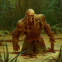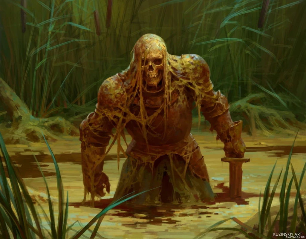 a fantasy creature that resembles a skeleton, standing in what appears to be a swampy or marshy area. The creature has yellow-