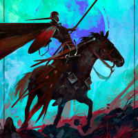 The image depicts a fantasy or medieval-themed scene. There is a knight riding a horse, which has reins in the knight's hands. The knight is wearing a helmet and armor, with a cloak draped over his shoulders, suggesting he may be on a mission or quest. A lance is also visible, further indicating that the character might be involved in combat or warfare. The background features a colorful, somewhat abstract or impressionistic landscape. The colors are vibrant and blend together, creating