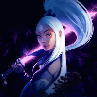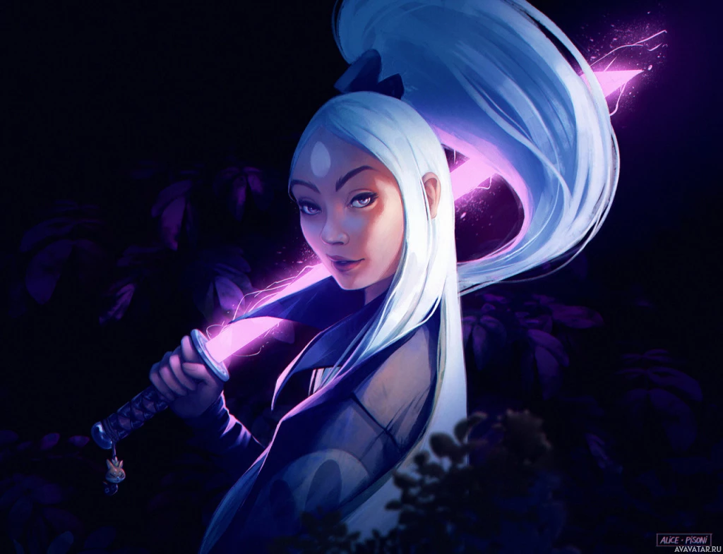 На картинке изображен анимационный персонаж, девушка с белыми волосами, стянутыми на затылке. У нее серьезное выражение лица, и она держит два меча скрещенными перед собой. Лезвия мечей покрыты магическими или энергетическими эффектами, что позволяет предположить, что она может быть воином или героиней из фантастического мира. Персонаж изображен на темном фоне с оттенками фиолетового освещения, что придает сцене мистическую атмосферу.