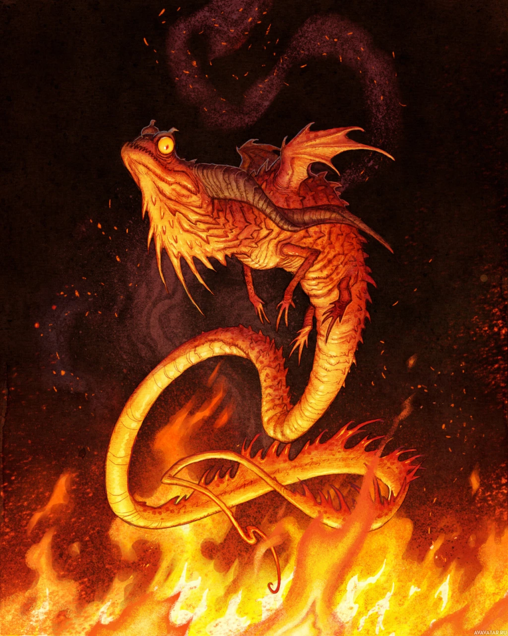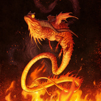 a fantasy scene featuring a dragon. The dragon has a prominent, fiery appearance with scales that seem to be glowing, and it is surrounded by flames, indicating that it might be in the midst of