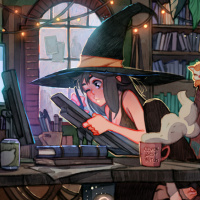 a pointed hat and has a book in front of her, suggesting she may be studying or reading. There are additional elements that contribute to the character's magical theme, such as a broomstick leaning against the wall and what appears to be a cauldron on a shelf above. The room also contains other items like