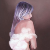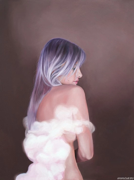 purple hair that is styled in a way that covers her face slightly. Her right arm and shoulder are exposed, while the rest of her body appears to be nude with a white, cloud-like texture covering the skin, giving an impression similar to marble or smoke. The woman's pose suggests she may be looking into the distance or not looking at all. The style of the painting is realistic with