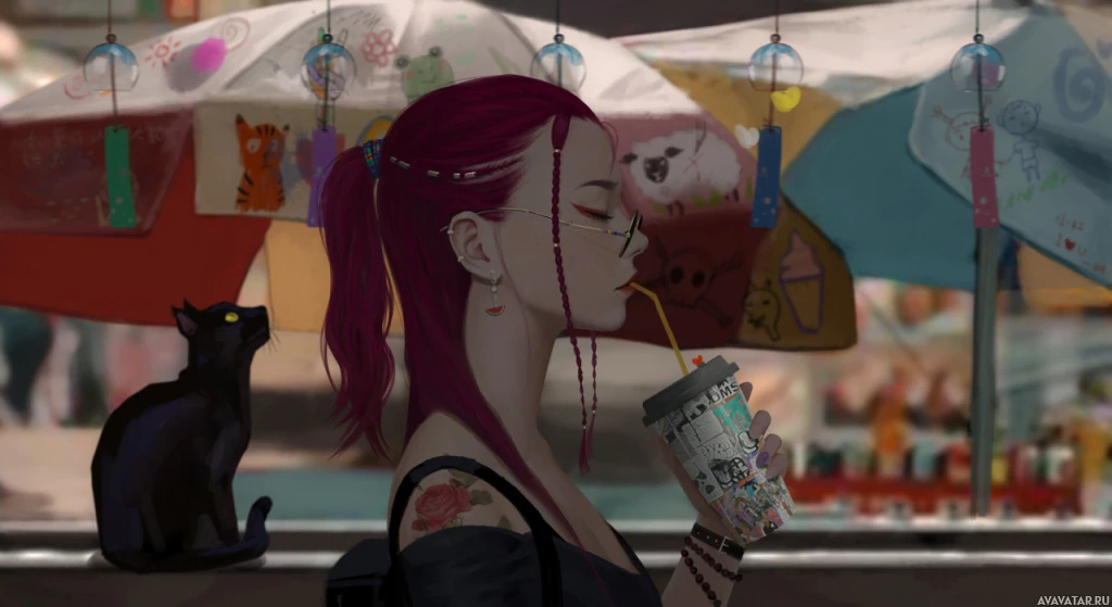 red hair, wearing glasses and a black outfit. She has her eyes closed while drinking from