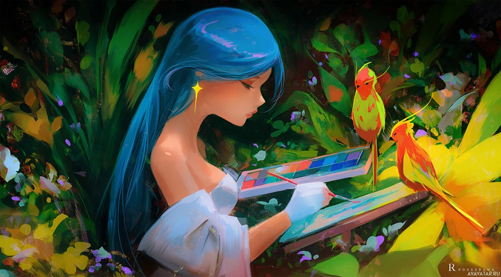 several birds around her; one bird is perched on the edge of the canvas, while others are flying or standing nearby. The overall style of the image suggests it could be from an animated film or series, characterized by
