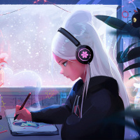white hair and headphones, engrossed in her work at a desk. She appears to be drawing or working on a digital