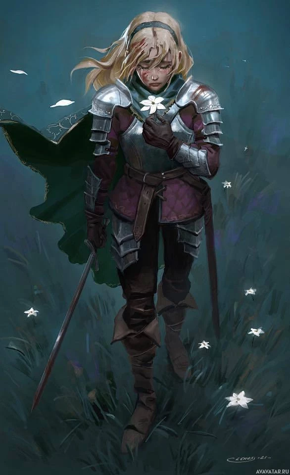 small flowers on the ground around her feet. The art style is realistic with a focus on detail, particularly in the textures of the armor and
