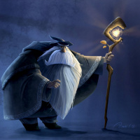 an animated character resembling Gandalf from the Middle-earth universe, as portrayed in various adaptations such as "The Hobbit" and "The Lord of the Rings." He is depicted holding a staff with a lit crystal on top, which is characteristic of his