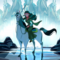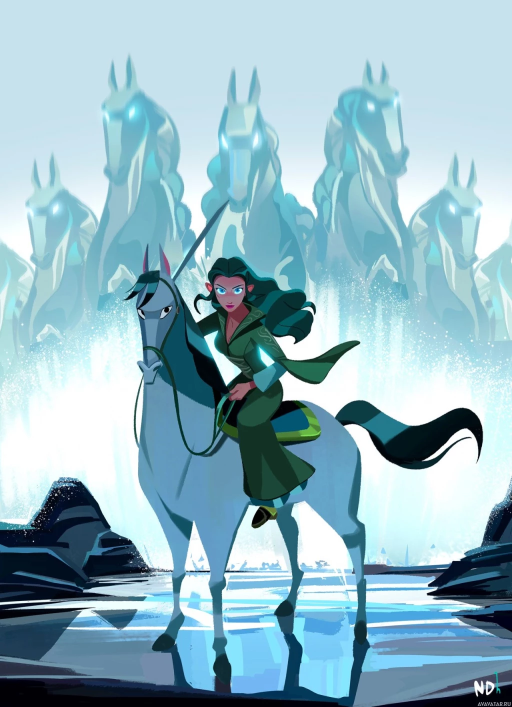 The image depicts a character that resembles Arwen from Middle-earth, who is riding a horse. The setting appears to be a magical or fantasy environment with large rocks and crystals in the background, which adds to the otherworldly